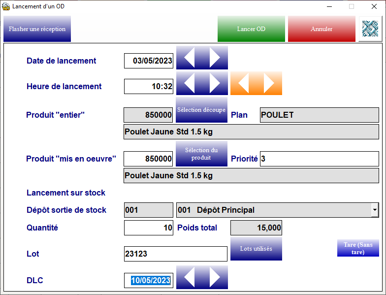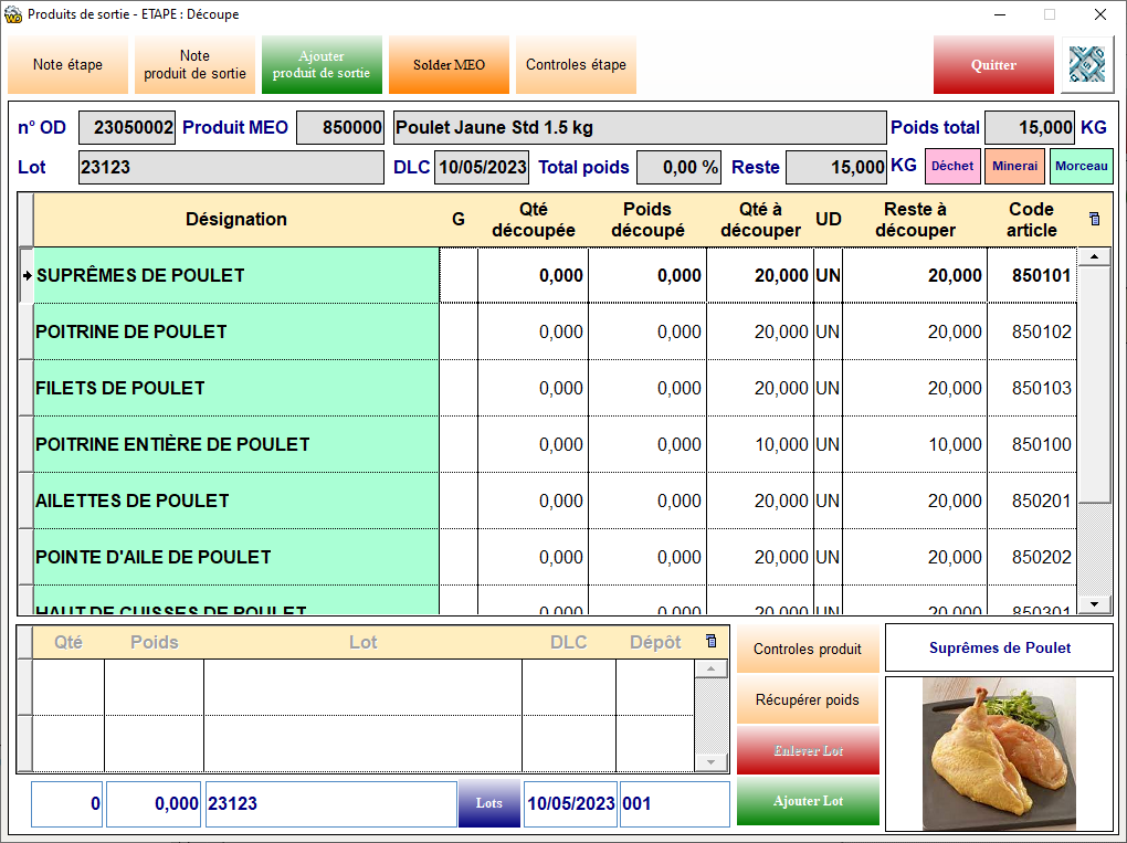 Le Produit Entier a été paramétré en UD dans le Plan de Découpe, ainsi c’est la Quantité qui sera demandée ; le Poids total est calculé en fonction du poids moyen de l’article renseigné dans sa fiche.