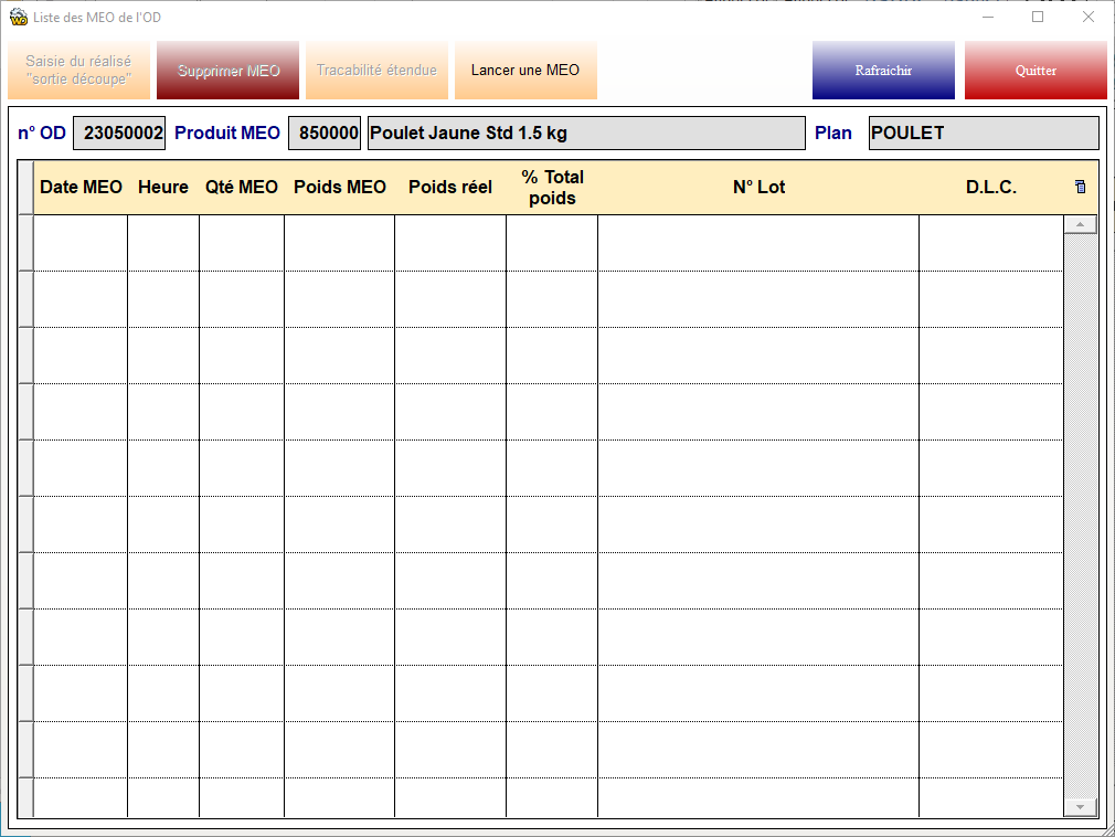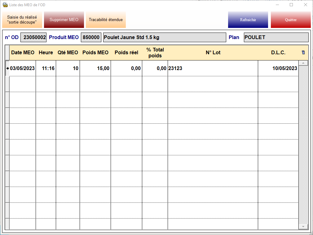 Le Poids réel obtenu n’est affiché que s’il y a eu une pesée au moment de la MEO, il s’agit sinon du Poids Moyen de l’Article renseigné dans sa Fiche.