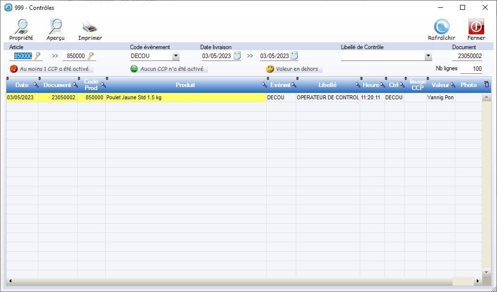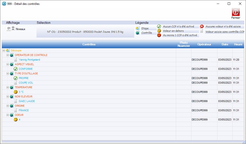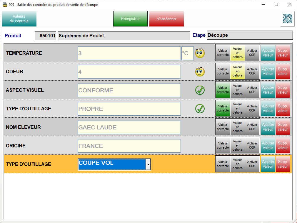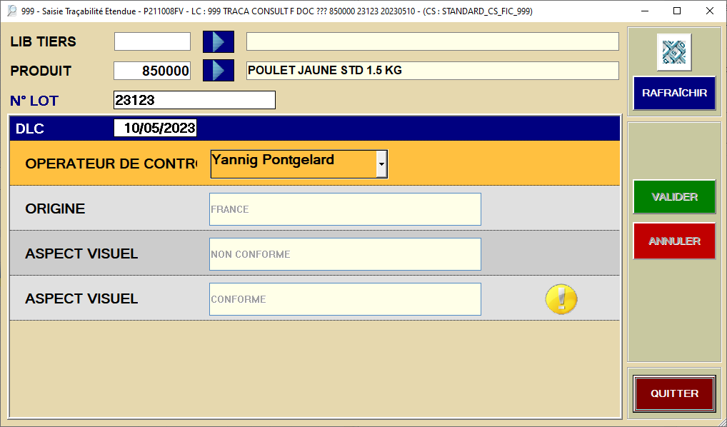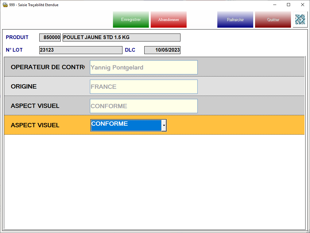 Si le Produit Entier est géré en Traçabilité Étendue, alors une fenêtre s’affichera automatiquement afin de renseigner les Contrôles prédéfinis.