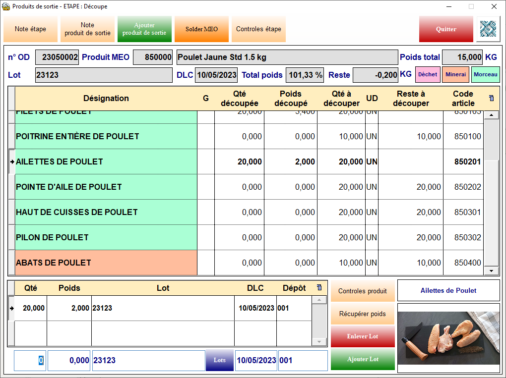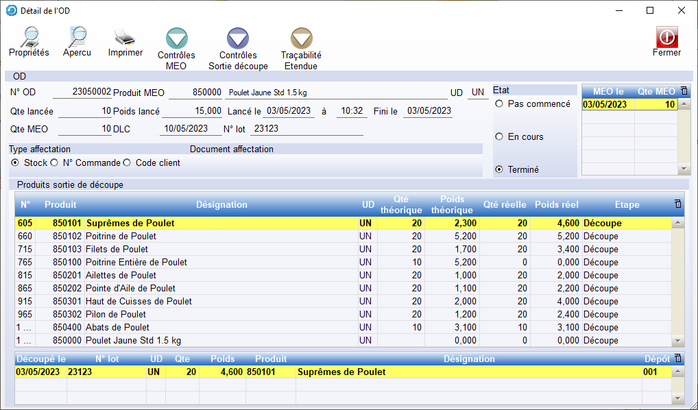 Le Détail de l’OD permet d’avoir toutes les données relatives au Produit Entier et aux Produits Sortie de Découpe.