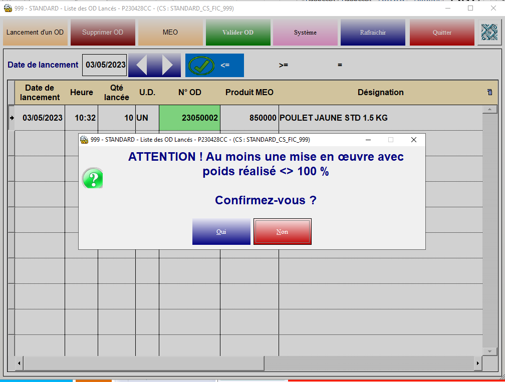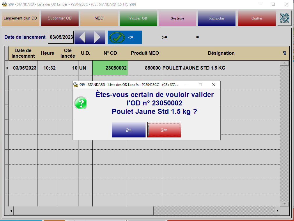 Une fenêtre informative apparait après avoir cliqué sur le Bouton « Valider MEO » afin de confirmer que l’OD à valider est le bon.