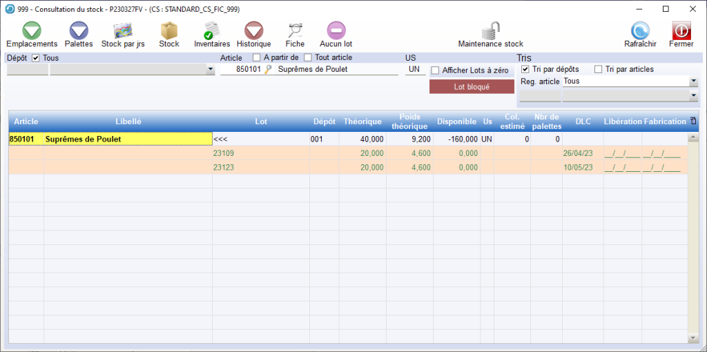 Si d’autres lots sont encore en stock, ils peuvent être sélectionnés en cliquant sur le bouton « Lots utilisés ».