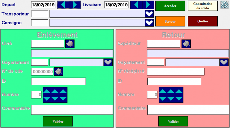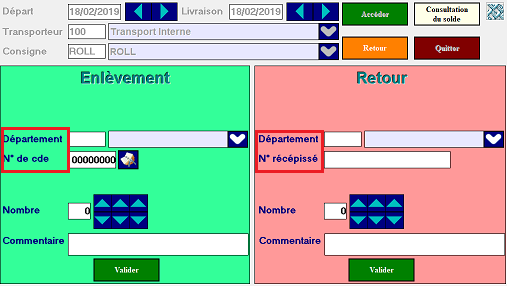 - L’icône Valider de la partie sur fond vert correspond à toutes les saisies de gauche(ce que votre transporteur va emmener) et inversement pour la partie sur fond rose(ce que votre transporteur vous ramène).