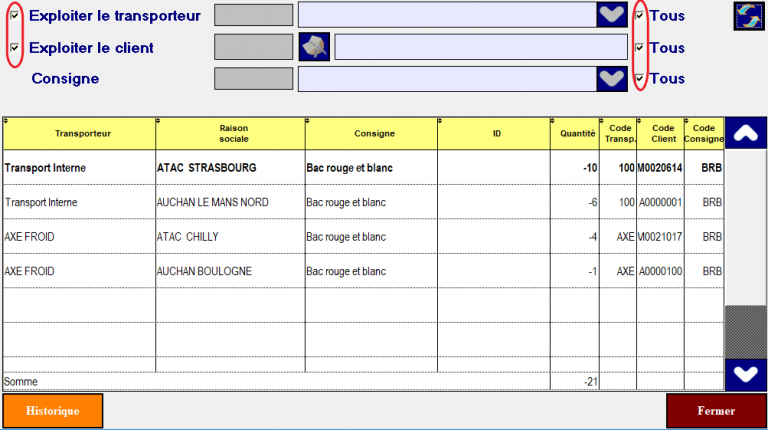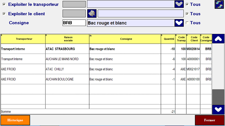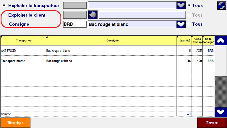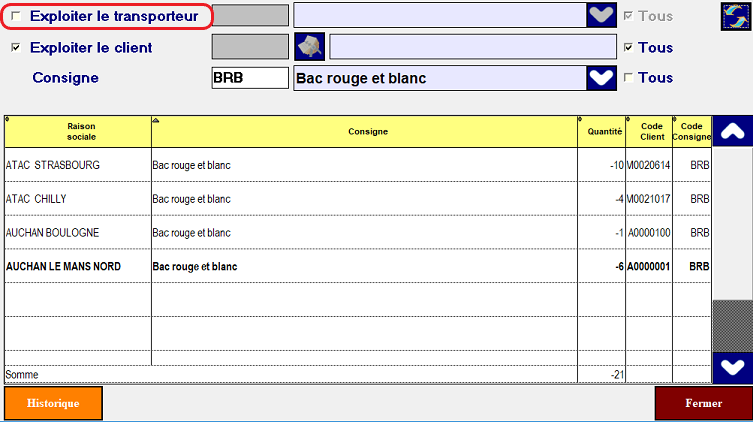 - Pour avoir le cumul des bacs par transporteur ,décochez Exploiter le client.
