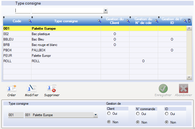 Pour créer un nouveau type de consigne :appuyez sur le bouton Créer et ensuite cliquez droit sur votre souris.