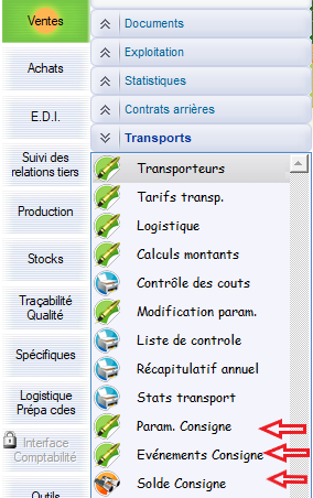 Le chemin d’accès AltaG : Vente > Transport > Param. Consigne