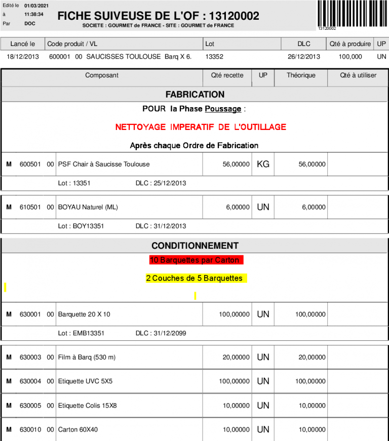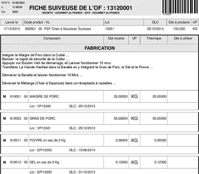 • Permet aux opérateurs de faire le Picking des Composants dans les différents ateliers et d’inscrire sur cette Fiche les informations de Traçabilité (Lot/DLc) et de pesée si nécessaire.