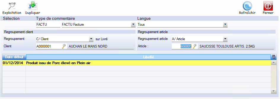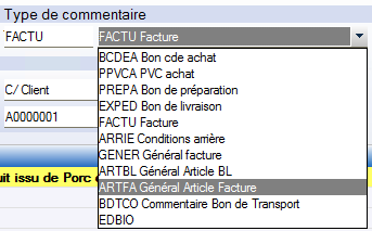 FACTU -> Facture, s ‘applique à chaque BL de la facture quand c’est un commentaire PIED. Ce commentaire est modifiable à la saisie de la commande et du bon de livraison