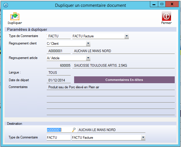 « Dupliquer Tiers » vous permet de dupliquer un commentaire vers un nouveau client et type de commentaire ,
