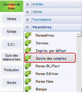 Paramétrage dans la Saisie des Comptes (Données de Base/Paramètres/ Saisie des Comptes) les Comptes CG TVA-Débit, TVA-Crédit et Les Comptes CG de HT Import en respectant le Paramétrage suivant :