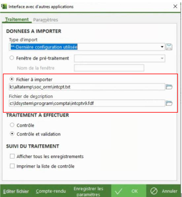 Fichier à Importer => k:\altatemp\soc_XXX\intcpt.txt (Chemin pour la Récupération du Fichier d’interface, XXX étant les trois lettres relatant la société)