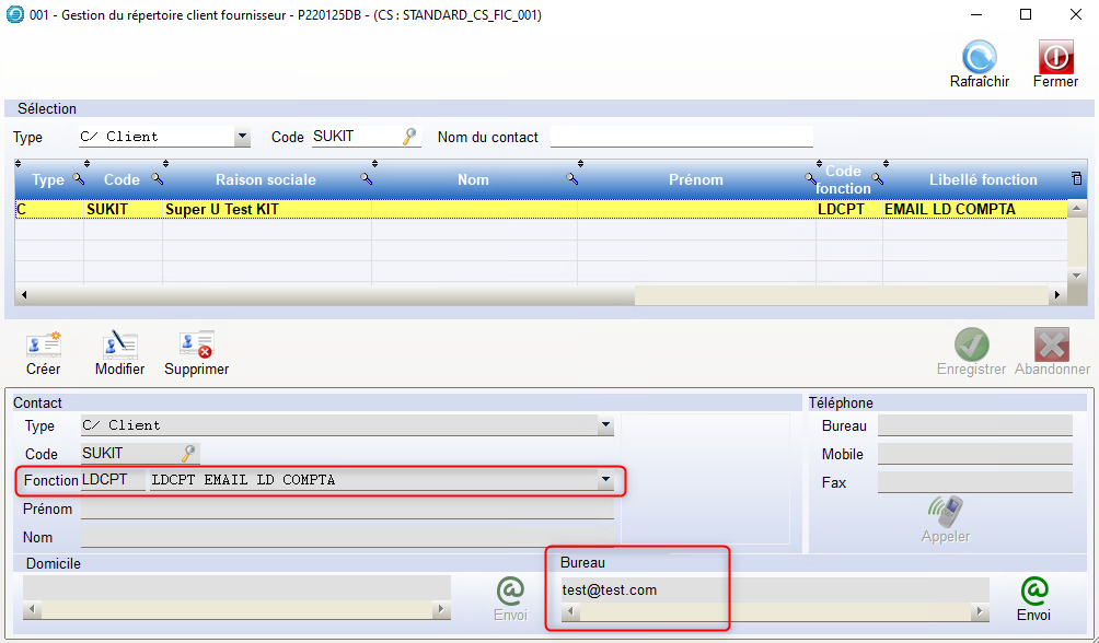 Si l’envoi du mail est activé, il est également possible de préciser un type de répertoire client (fonction) pour récupérer le mail