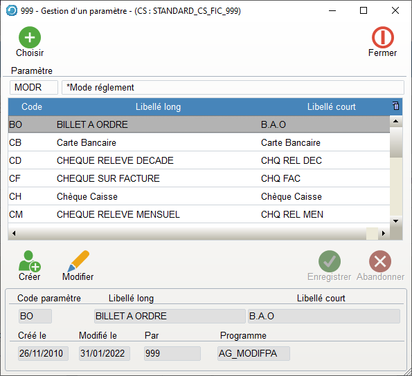 MODR – Mode de règlement – Thème CLIENT FOURNISSEUR FACTURATION