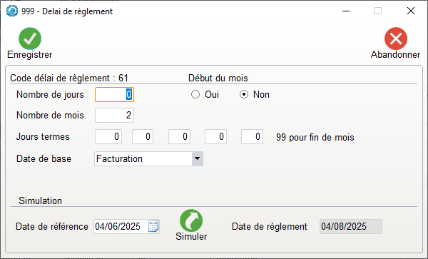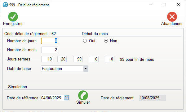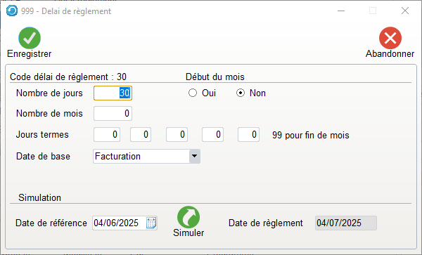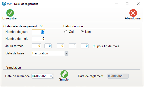 - Il faudra renseigner le premier champ de jours termes avec 99