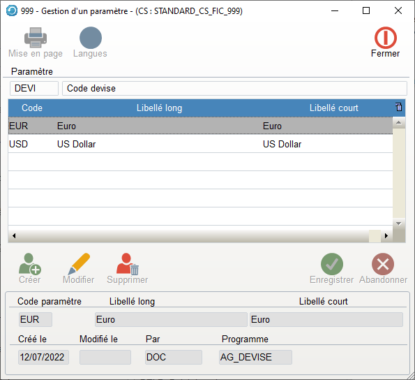 - Il est fortement conseillé de paramétrer les autres devises utilisées avec les codes usuels.