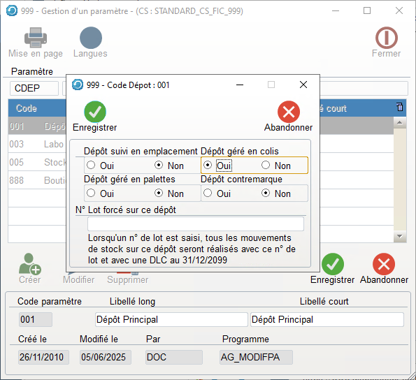 - Un article ne peut pas être géré en lot sur un dépôt et sans lot sur un autre.