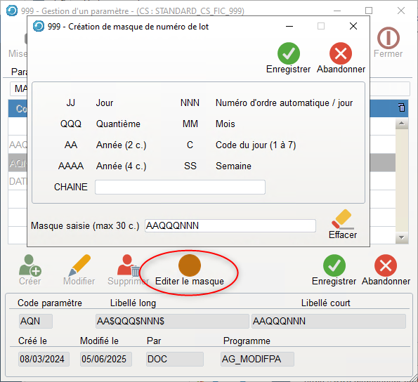 - Il permet de générer des no de lot formatés avec le « masque » défini