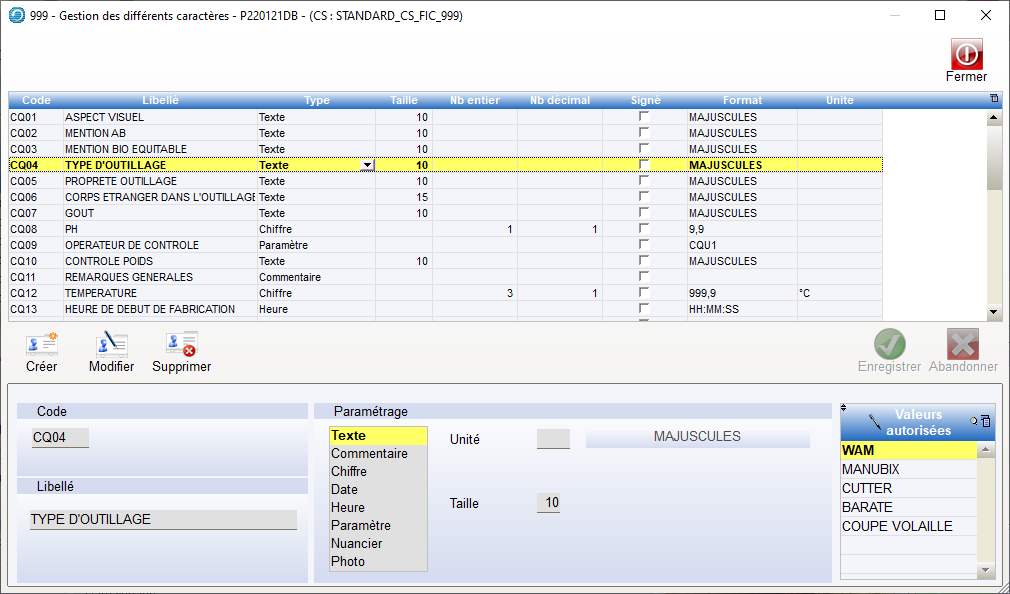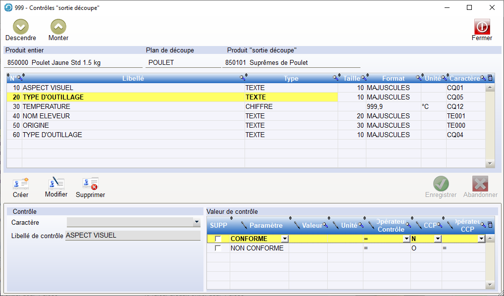 Les libellés et les valeurs autorisées qui y sont associées sont valable quelque soit le Plan de découpe (Bœuf, agneau, etc). Ces Contrôles sont également les mêmes que ceux qui peuvent être intégrés à une recette.