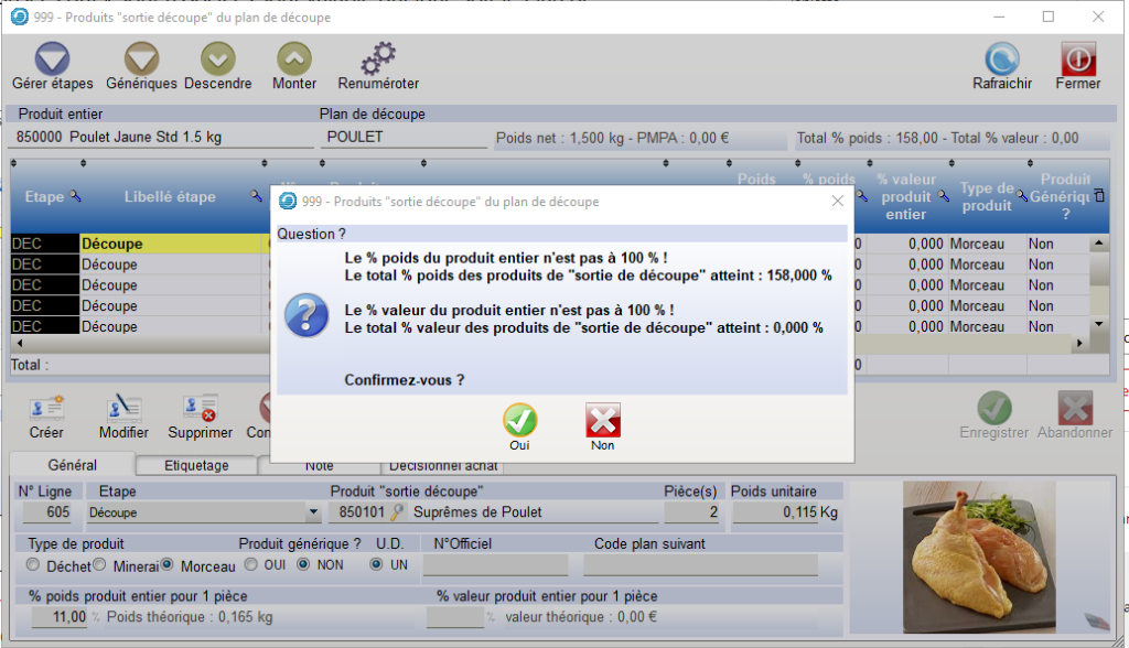 Lors de la fermeture du Module « Plan de Découpe », un message apparait afin de signaler le % de poids et de valeur des produits Sorties découpes en fonction du Produit Entier.