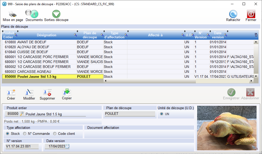 Pour incrémenter les différents articles découpés venant du Produit Entier, cliquer sur le Bouton « Sortie Découpe ».