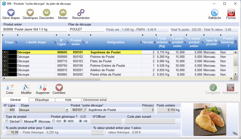 Par exemple, pour un poulet de 1 kg, et pour des Produits découpés tels que des Suprêmes à 0.230 kg, le pourcentage sera de 23% pour un Suprême.