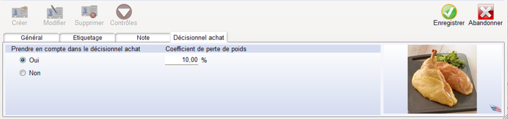 Si le Produit Découpé doit être pris en compte dans le Décisionnel d’Achat, alors cocher « Oui » en indiquant également un coefficient de perte en %.