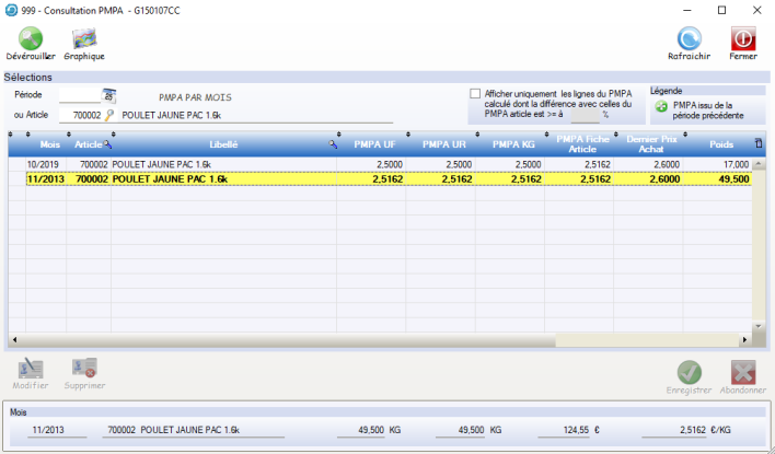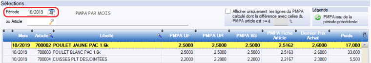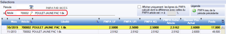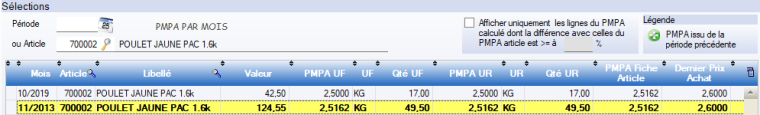 - Contrairement au calcul des marges, vous ne pouvez pas rechercher le PMPA daté dans l’historique.