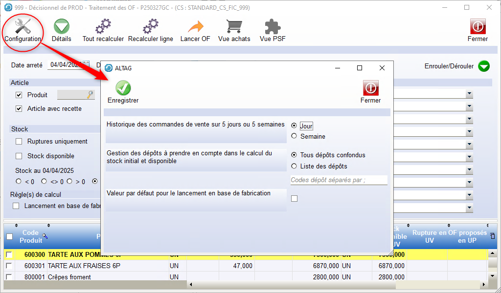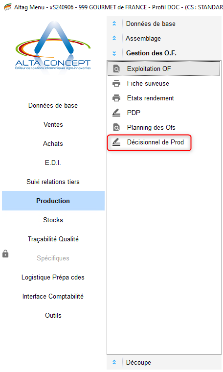 D’après le menu AltaG : Production / Gestion des OF / Décisionnel de Prod.