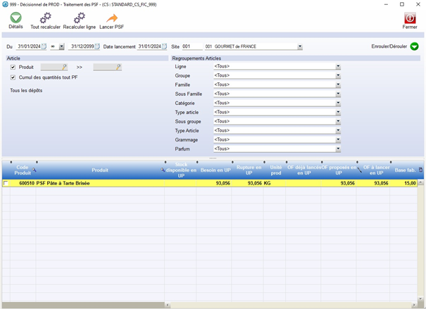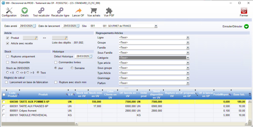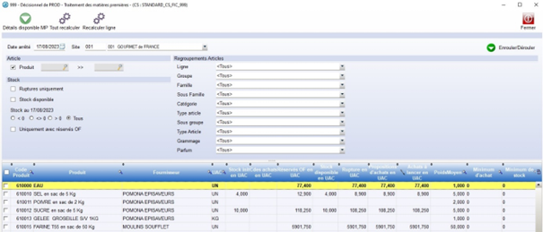 Afin de pouvoir pré-calculer les besoins en PF, PSF et en Matières Premières l’application va afficher le cumul des commandes, le stock disponible et les OF en cours d’exécution.