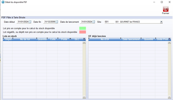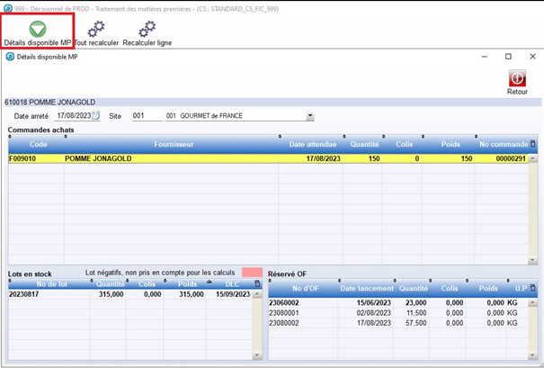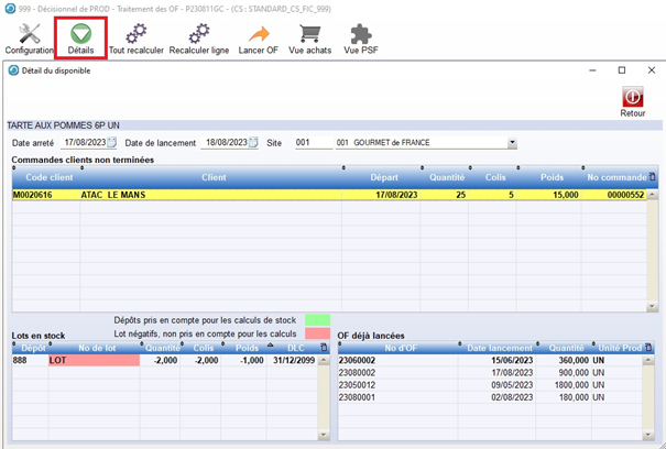 Le bouton « Détail » permet de visualiser les lots pris en compte dans le calcul du stock disponible et les OF déjà lancés et non terminés.