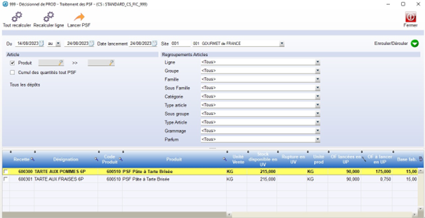 Afin de pouvoir valider la modification de poids ou de quantité; il est nécessaire de cocher la ligne portant à modification avant de cliquer sur le bouton « Lance PSF ».