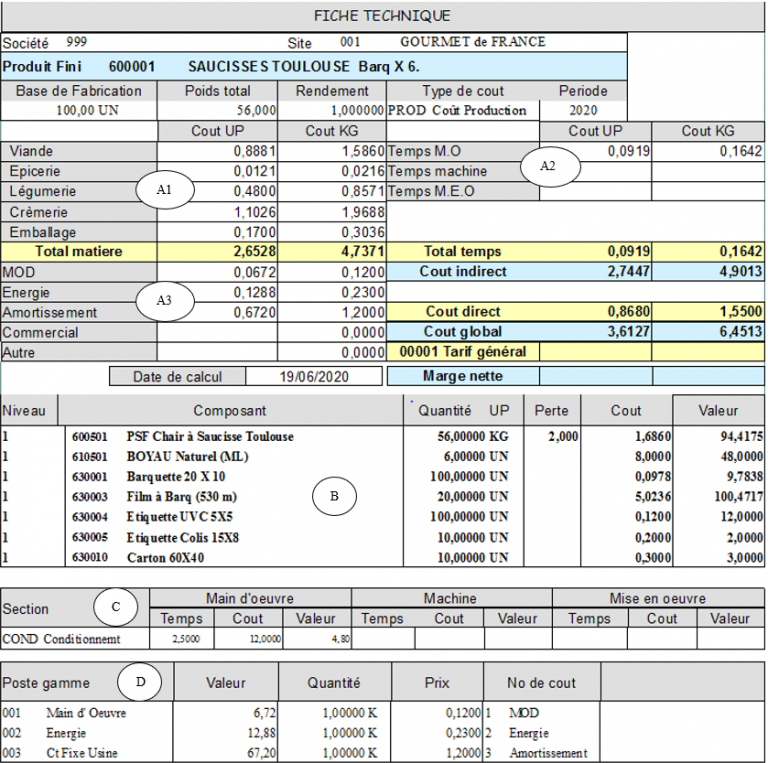 D – Tableau Détail des Postes Gammes (Coûts indirects) avec pour chacun la Valeur, le coefficient de mise en oeuvre (quantité), la base de Calcul du Poste Gamme (K – Coût Kilo / P – Coût par Unité de Production) et le coût unitaire selon la base de calcul. Affichage du Tableau si Gestion des gammes a été cochée en sélection.