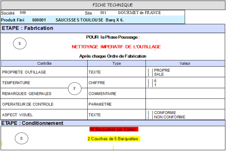 E – Détail des Notices renseignées par Etape. Ces notices sont assez importantes, elles s’affichent sur le poste Atelier sur les étapes concernées, ces notices relatent des recettes de cuisine, des conseils sanitaires, des impératifs de conditionnement, etc… Dans notre exemple, nous avons une notice sur l’Etape Fabrication et une notice sur l’étape Conditionnement. Affichage des pavés si Note Etape a été coché en sélection.
