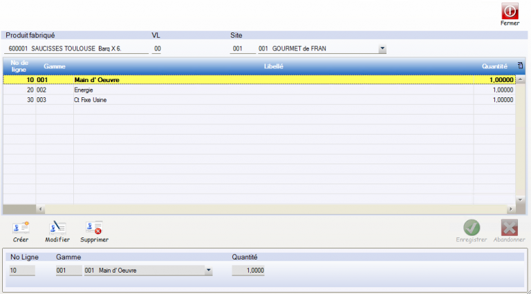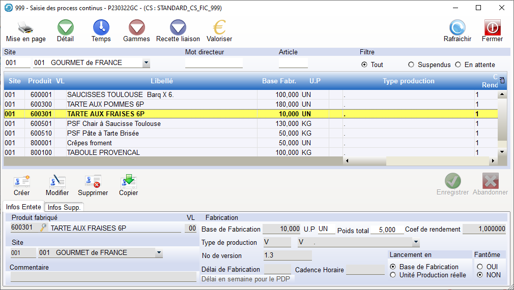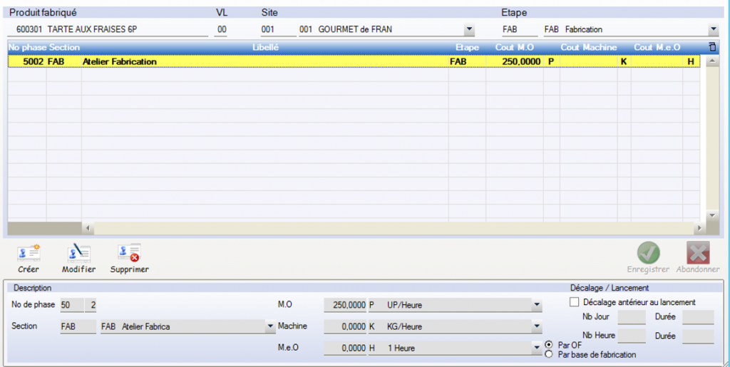 Base de fabrication : En fonction de l’Unité de Production (UN ou KG) du Produit, Indication de la Base de Mise en Œuvre du Produit. Ex : La recette des composants du produit 600301 est saisie pour une fabrication de 10 unités. remarque : le lancement des Ofs peut se faire sur une base différente de celle de la recette.