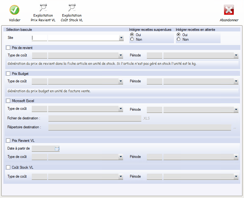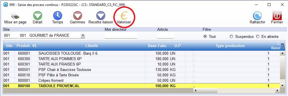 Cette fonction permet de valoriser un lot (ou toutes) de recettes. Remarque : il est inutile de lancer les valorisations par « niveaux » , le logiciel recalcule systématiquement les valeurs des PSFs qui sont nécessaires dans les recettes en cours de calcul.