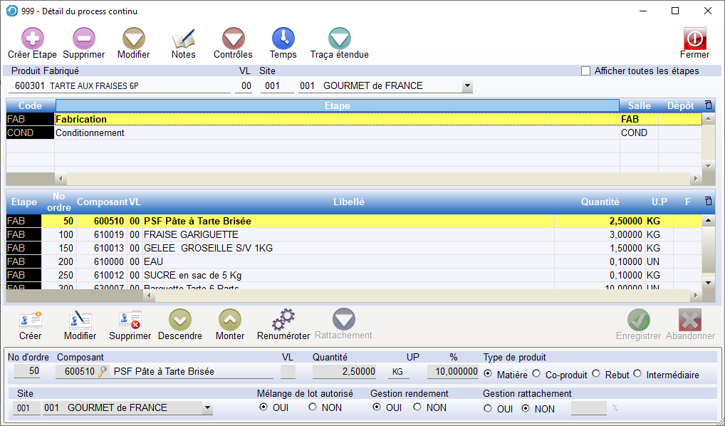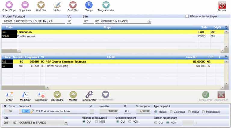 Créer Étape : Au moins une étape est obligatoire. L’éclatement de la saisie de la recette en plusieurs étapes permet de gérer la saisie de production en atelier de façon plus « fine ». Attention revoir le plan d’étapes d’une recette nécessite de refaire la saisie des composants totalement.