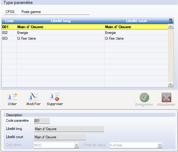 Paramétrage des Types de Coût