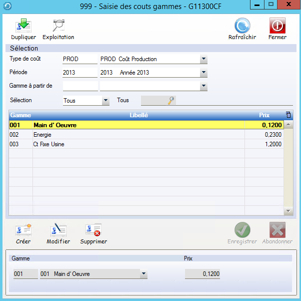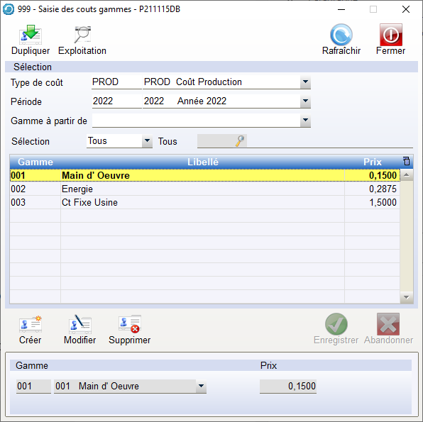Le chemin d’accès :Production > Données de Base > Coûts gammes