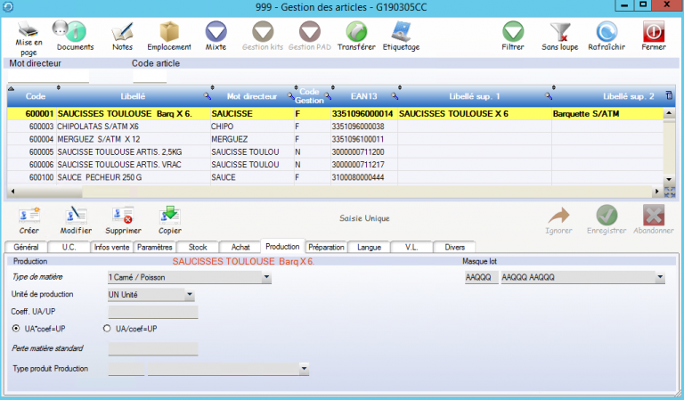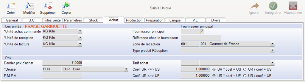 Pour les Matières Premières et Emballage : L’unité de Production à l’unité (UN) ou au Kilo (KG) détermine la base de consommation du produit (par ex il faut 10kg de sucre ou 10sacs de sucres). Le Type de Matière sert à affecter le coût du composant dans un critère d’analyse des coûts (5 critères possible.. voir le chapitre « Valorisation des Recettes« ). Le coefficient UA/UP sert à convertir le prix d achat en prix « unité de production » (par ex conversion « m2 et 1 étiquette, pour du film)