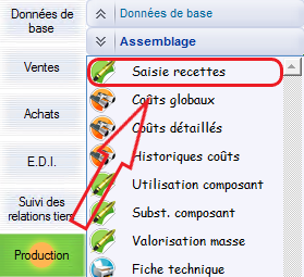 Le chemin d’accès :Production > Assemblage > Saisie recettes