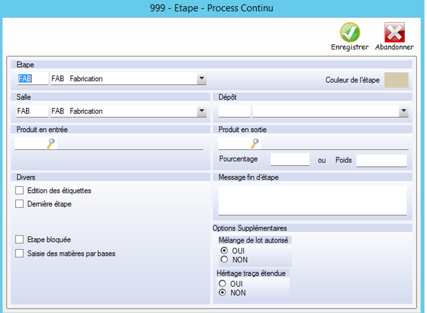 Héritage Traça étendue = OUI : Si le Produit Fabriqué est paramétré avec des Critères de Traça étendue, un transfert de Traçabilité étendue s’effectuera automatiquement avec Concordance de la Traçabilité étendue des Composants de cette étape.
