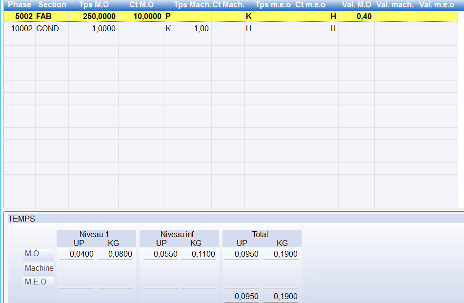 Répartition des coûts temps : Les coûts Temps sont regroupés sur MOD, MA ,MEO selon les coûts paramétrés dans les sections de la recette.
