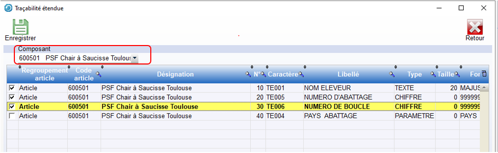 Choisir le Composant Référent de la Recette qui va servir au transfert de Traçabilité étendue et Sélectionner les Critères de Traçabilité étendue qui devront être transférés… En Production, à chaque Lot ajouté, des Contrôles de cohérence seront effectués :