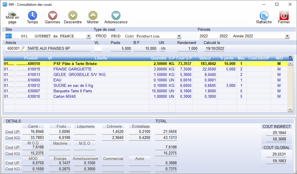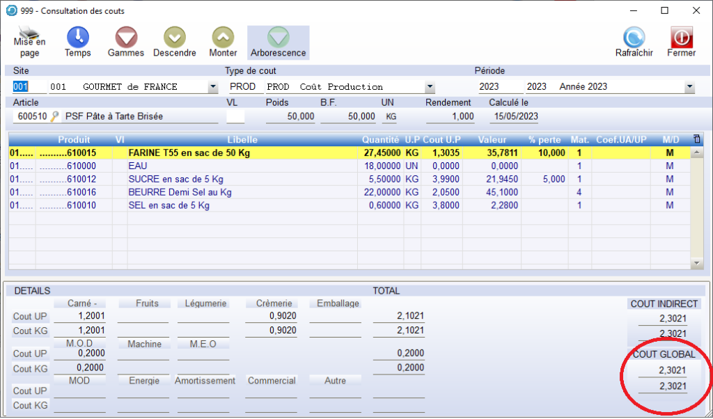 Coût indirect = Coûts matières (produits secs, fruits ..) + coûts temps (MOD, machine,MEO) Coût global = Coût indirect + coûts fixes (énergie , amortissement ..). Les 1eres lignes sont exprimées en « coût base de fabrication » , les 2eme ligne en « coût KG » ici le coût global est de 29.5631€ pour 1 tarte et de 59,1063€ en coût kg.