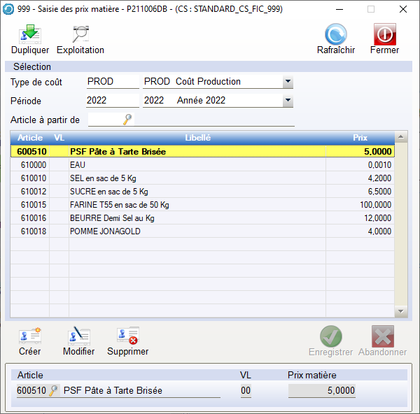 Le prix des matières mises en œuvre dans la recette est le « PMPA » de la fiche article , ou à défaut le « Dernier Prix d’Achat » de la fiche article. Il est aussi possible d’enregistrer un prix personnalisé pour une « période » et un « type de coût ». Le chemin d’accès :Production > Données de Base > Prix matière