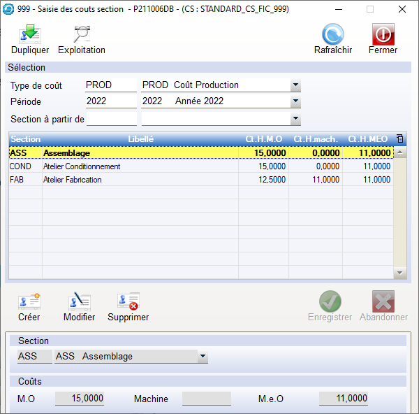 Enregistrer pour chaque section les coûts horaires , ici 15 euros/heure en coût Main d’œuvre.