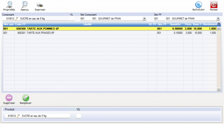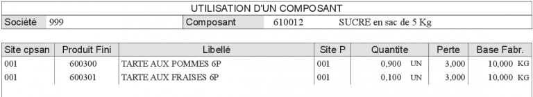 La liste des recettes contenant cet ingrédient apparait avec la quantité de mise en oeuvre pour chaque recette par rapport à la base de fabrication (ex : il faut 0,100 Kg de sucre (610012) pour 10 tartes aux fraises (600301)).