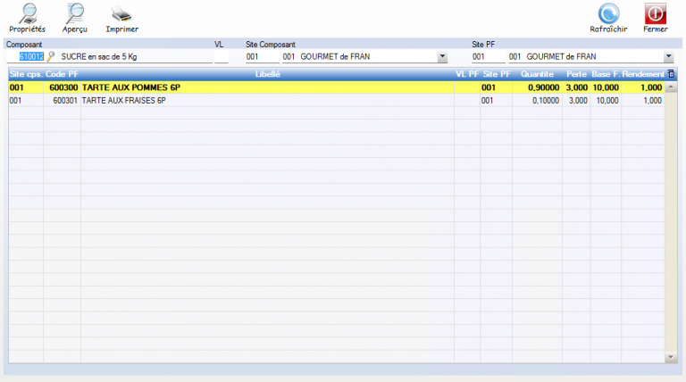 - Choisir le Composant (Ingrédient) puis cliquer F5 ou le bouton Rafraîchir.
