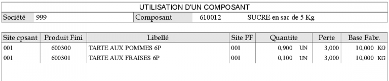 - La liste des recettes contenant cet ingrédient apparait avec la quantité de mise en oeuvre pour chaque recette par rapport à la base de fabrication (ex : il faut 0,100 Kg de sucre (610012) pour 10 tartes aux fraise (600301)).