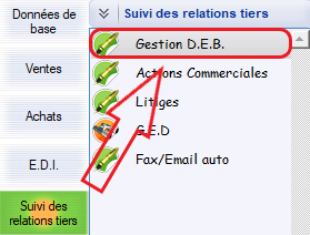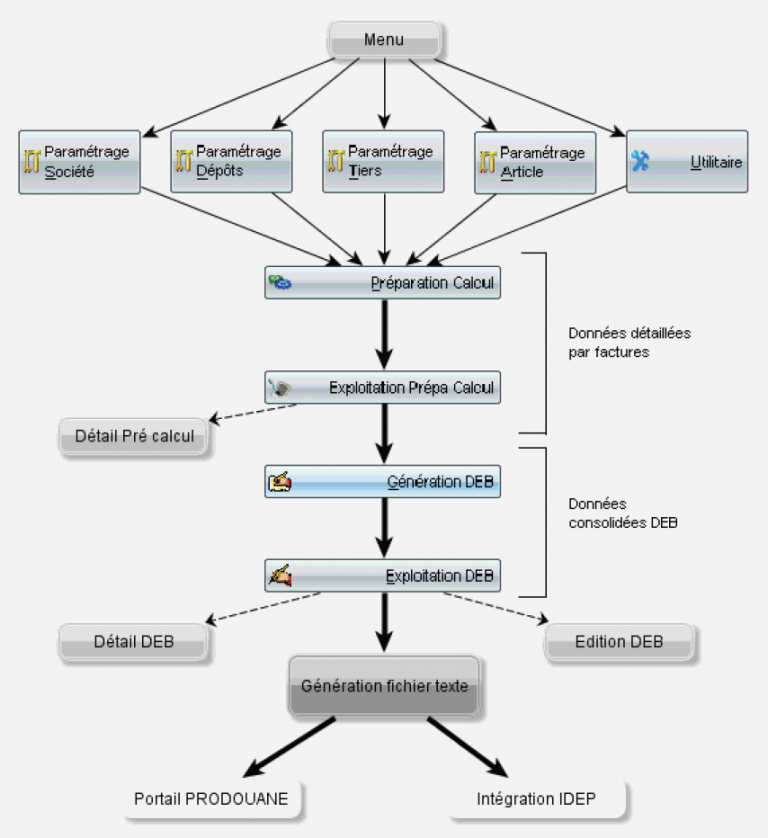 Le menu permet de gérer intégralement la DEB du paramétrage à la déclaration.